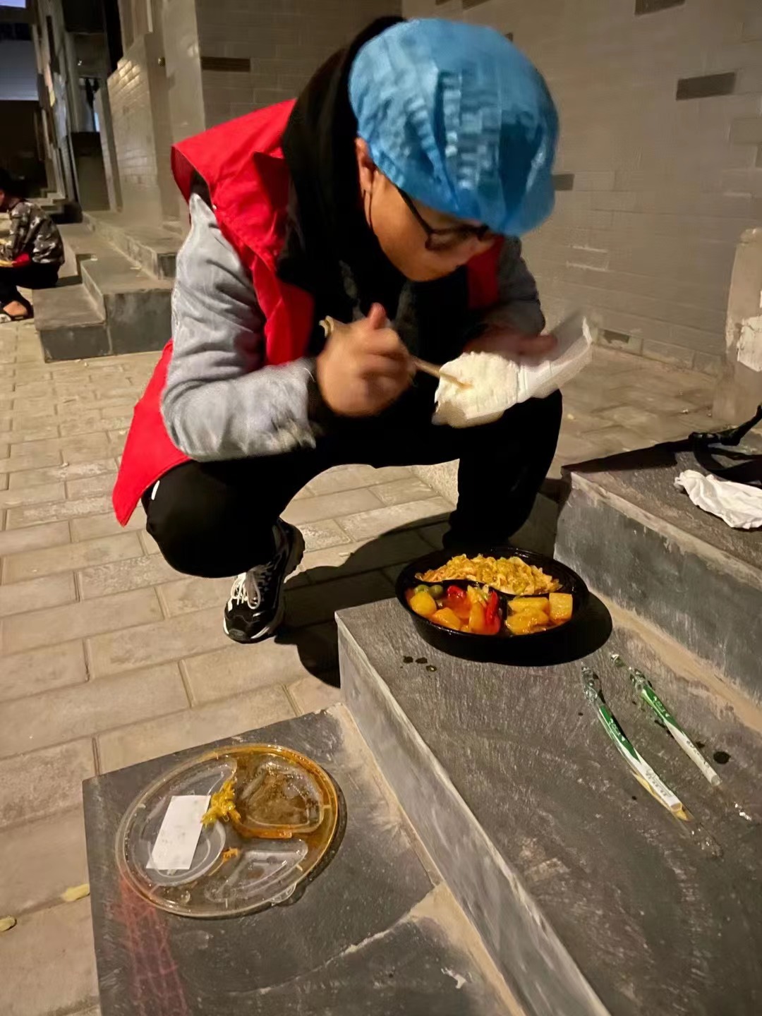當飛哥得知銀川市要全員采集核酸,急缺志愿者時,第一時間發出征集令,號召了10余位熱心人士投身志愿服務中。他們一起穿上鮮亮的“紅馬甲”及“白戰袍”,全天奔走在各個社區,每天爬樓六七十層,用盡了四個大喇叭的電池,每天隨意在街邊蹲著扒拉幾口就是一頓飯,常常凌晨12點還因為群眾排隊檢測核酸而不能收工。
